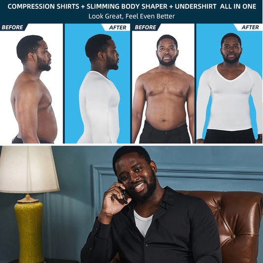 Men’s Long Sleeve V-Neck Compression Shirt – Slimming Body Shaper Undershirt for Tummy Control & Workout Support